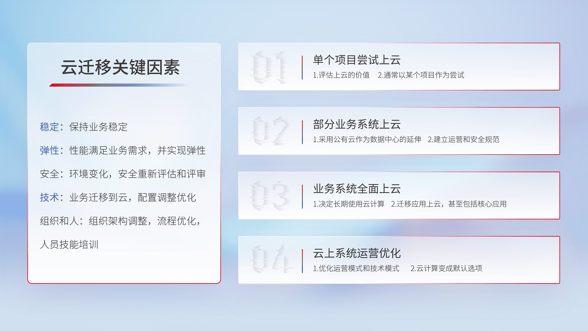 结合实际业务,,,,从规划设计、、、云平台选型、、、云原生改造、、数据迁移、、、、集成交付,,,,迁移全过程为客户识别最佳上云路径,,,,做好风险识别管理,,设计网络架构、、、、身份权限、、、、安全审计合规、、、操作审计、、、日志审计、、、、监控告警策略、、多站点容灾设计等,,,对云上基础设施进行整体规划,,,,提升IT治理水平,,,以满足弹性、、高可用、、、高性能的需求。。。