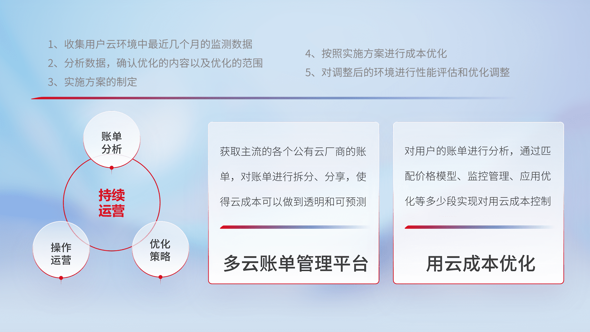 通过多云纳管,,,,以统一的资源数据模型把客户的云资源进行抽象和封装,,,,进而实现对多云资源的统一操作,,保障云资源管理的可靠性、、稳定性与可用性。。。量身定制化运维内容,,配置、、、开发运维、、、、补丁管理、、备份、、监控、、、认证和访问管理、、审计和日常巡检等,,保障在用云过程中的可靠度,,,稳定度以及高可用率。。